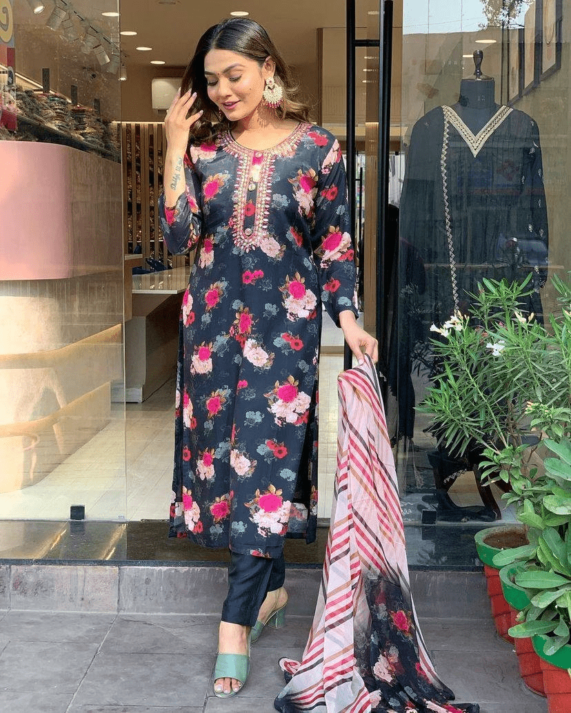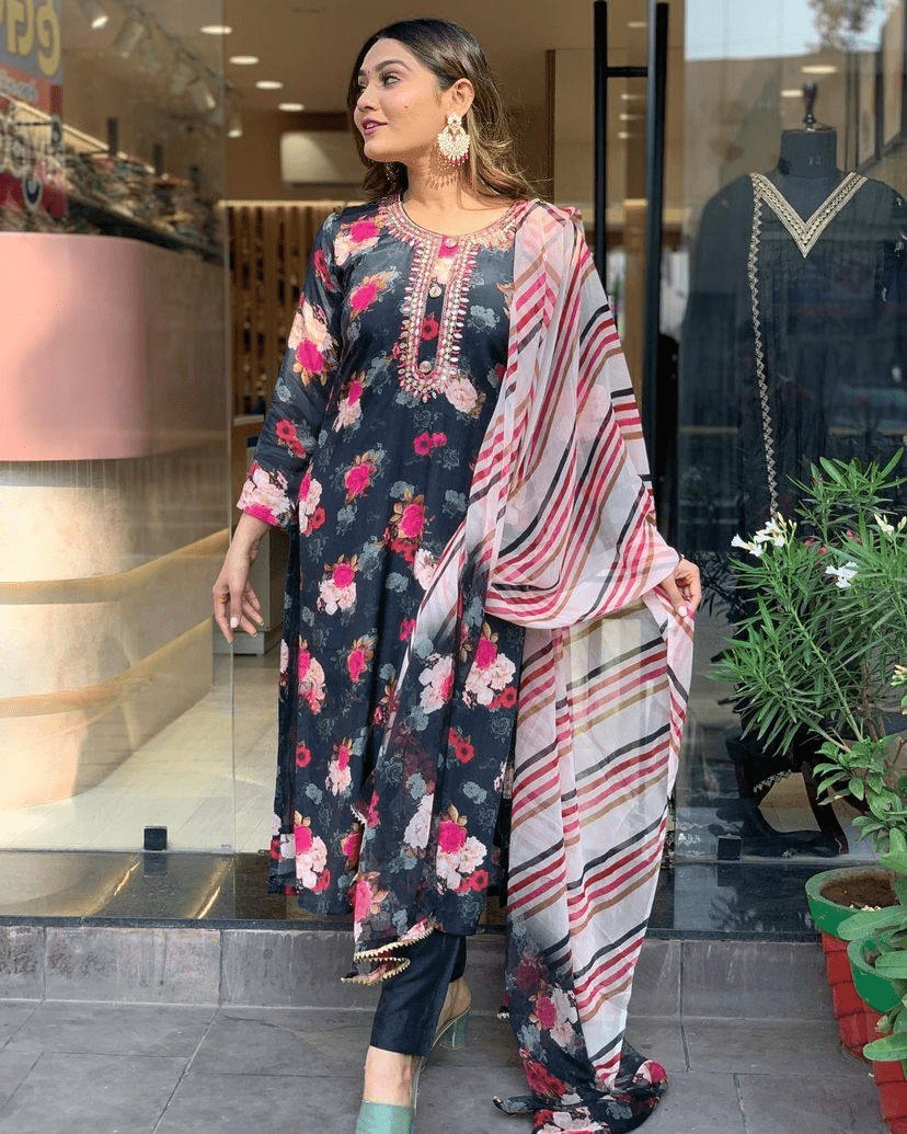 This stunning black kurta set is a sophisticated blend of tradition and style. The kurta features vibrant floral prints in rich tones that contrast beautifully against the deep black base. Intricate embroidery along the neckline adds a layer of artisan charm, while the classic straight-cut pants enhance its timeless silhouette. A striped dupatta in complementary hues finishes the ensemble with a modern flair. This look strikes the perfect balance between festive elegance and versatile styling—ideal for family celebrations, festive outings, or evenings that call for just the right amount of color and charm