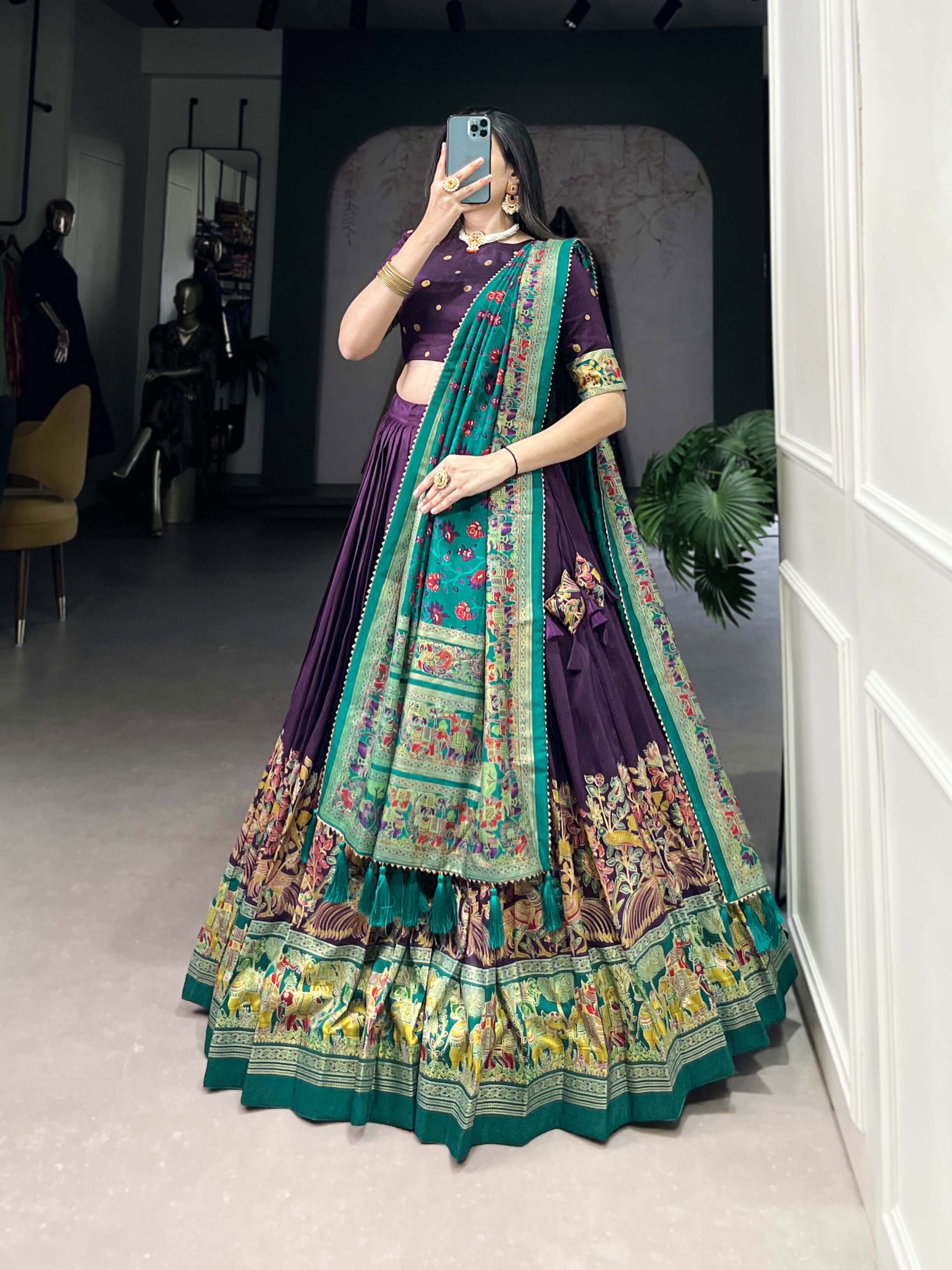 Celebrate your vibrant self with the Exquisite Floral Fantasy Lehenga Choli, a Tussar silk creation that redefines grace. The lehenga is adorned with an artfully arranged floral and botanical print, creating a timeless silhouette ideal for festive celebrations.