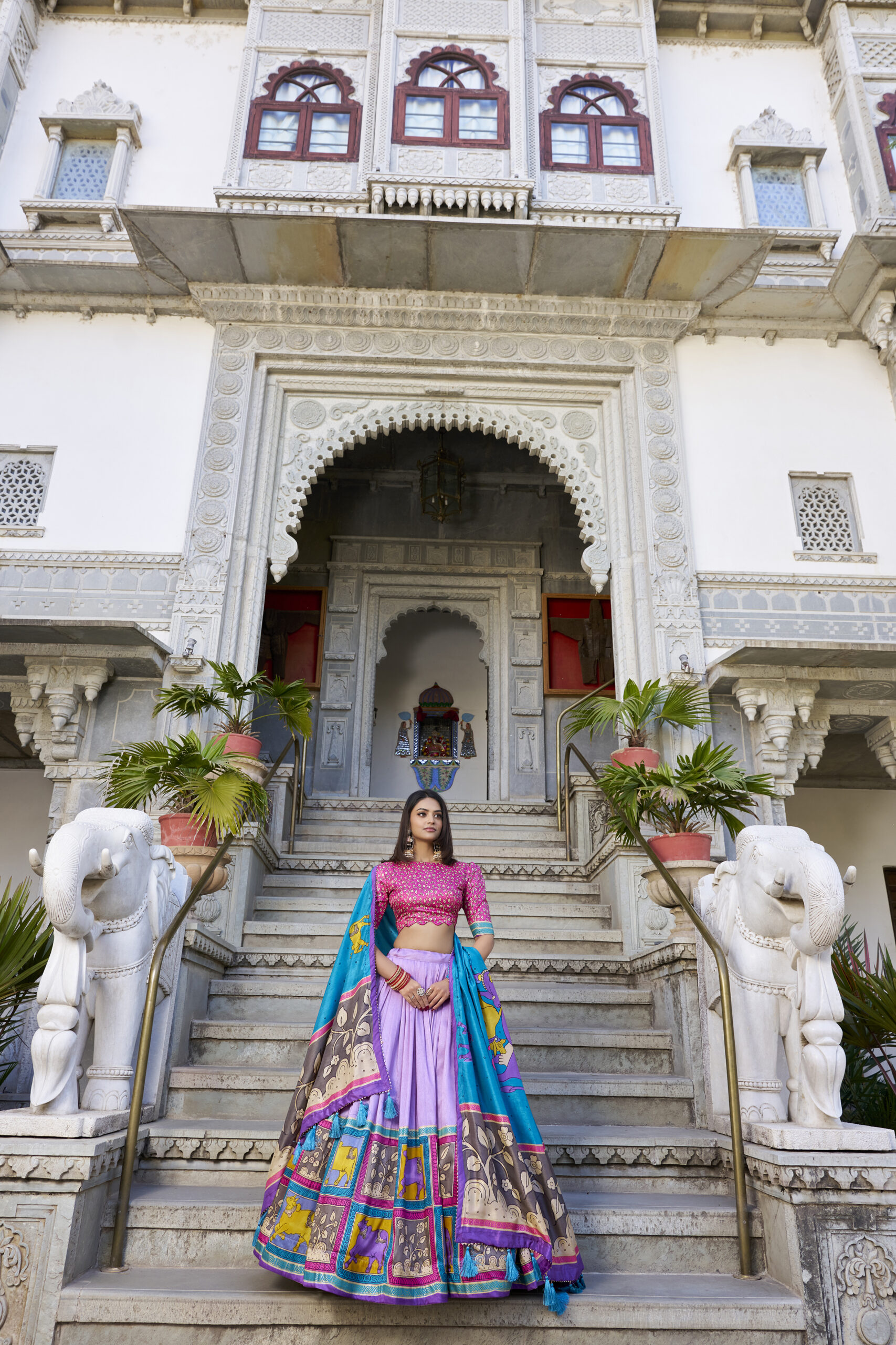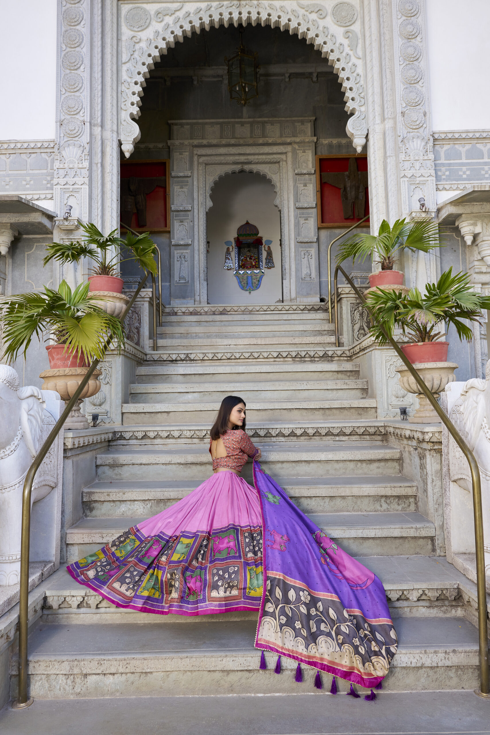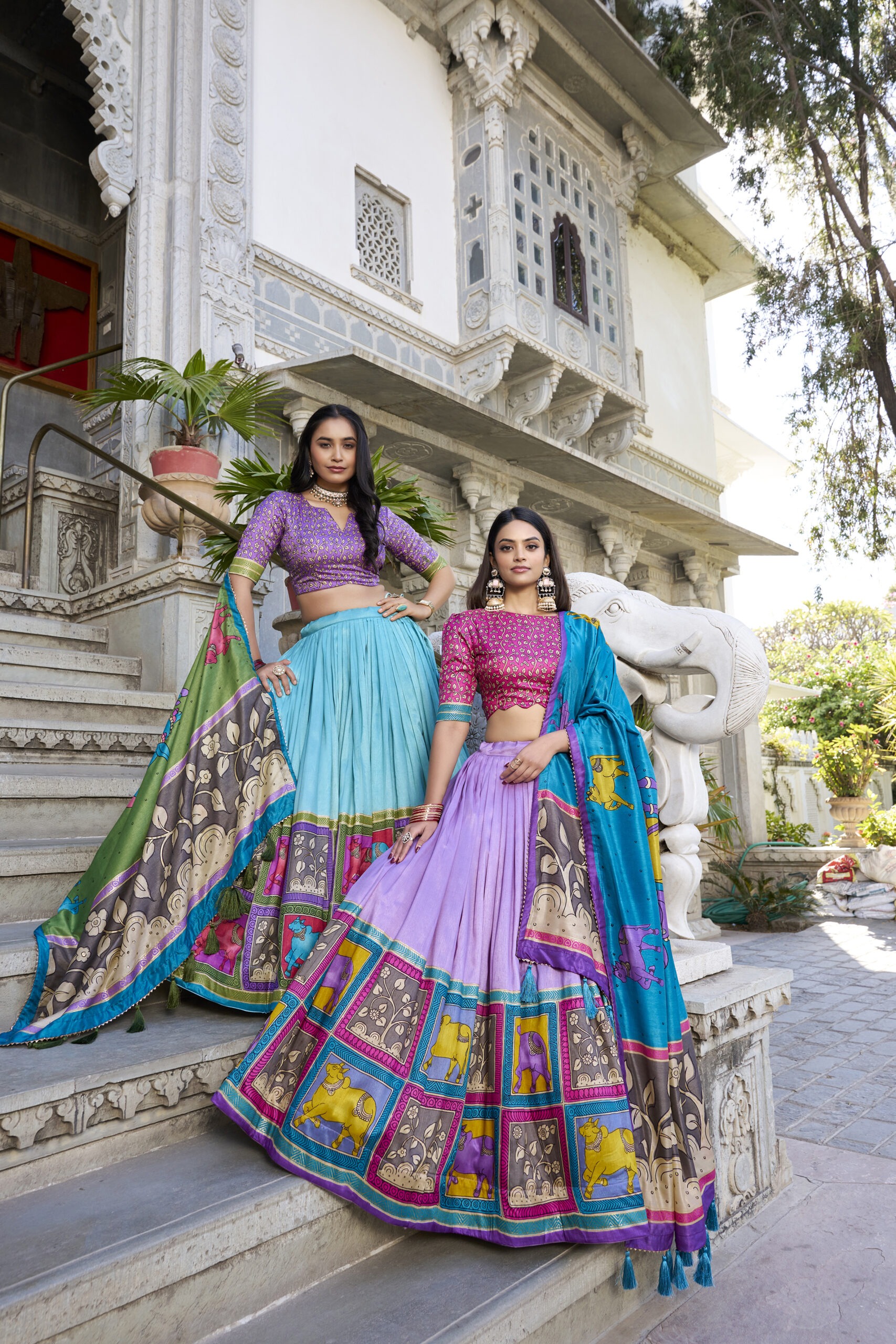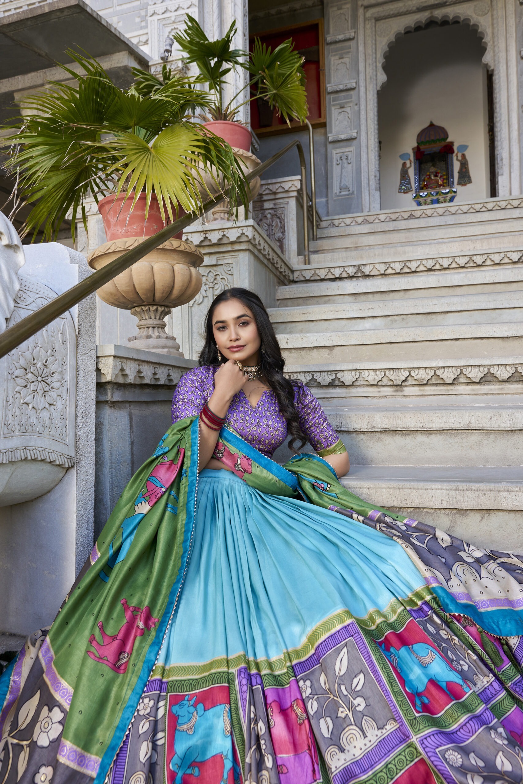 Step into the spotlight with our Exquisite Floral Fantasy lehenga choli set, a radiant blend of tradition and contemporary charm. Crafted from luxurious Tusser Silk, the lehenga flaunts an elegant floral print infused with delicate foil work for a subtle shimmer. With a flattering stitched finish, it features a canvas belt for added structure, a comfortable micro cotton lining, and a supportive fit up to 44 inches with zip closure. Its sweeping 3-meter flair and 41-inch length promise a graceful, flowing silhouette designed to dazzle.