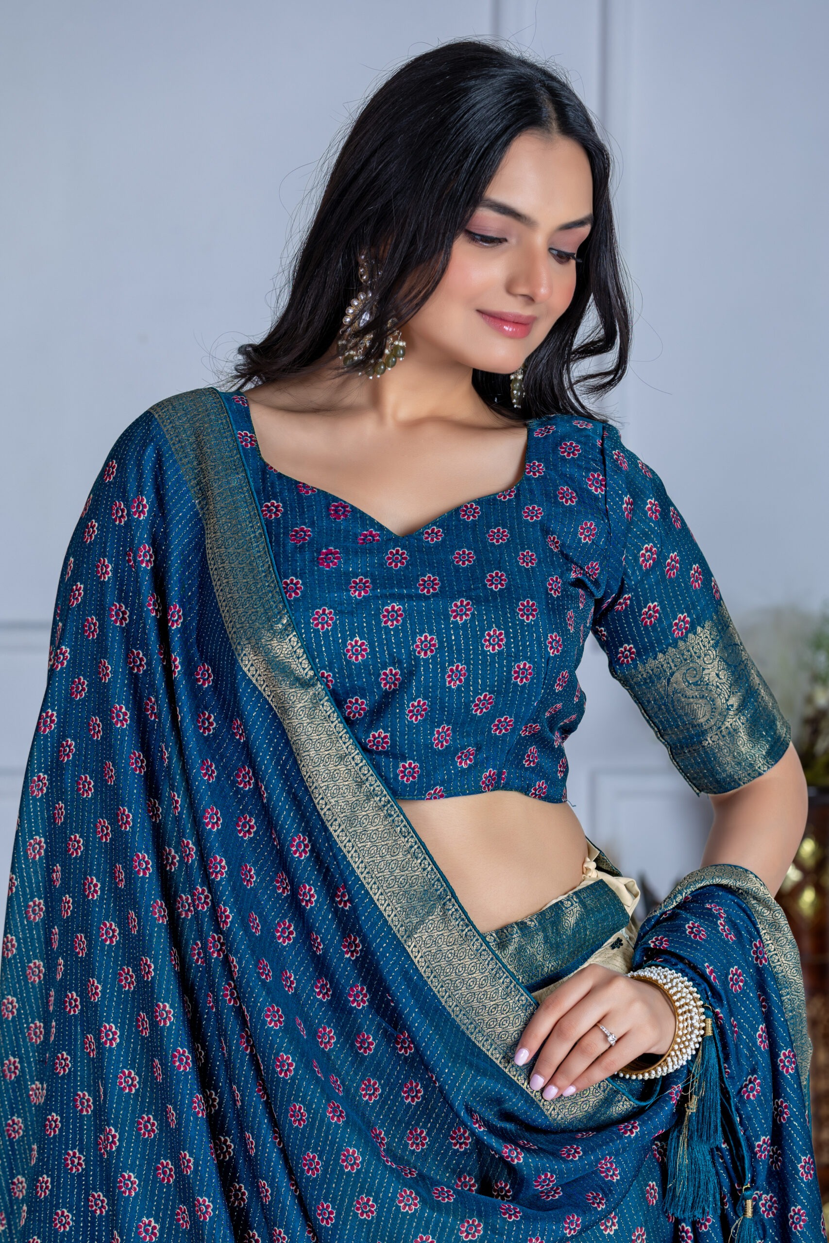 The unstitched blouse piece, made from the same Heavy Lichi Fabric with a jacquard border, perfectly complements the lehenga. It features matching jacquard work with zari lining and print, allowing for custom tailoring to your unique style and preference. The blouse fabric has a length of 1 meter.