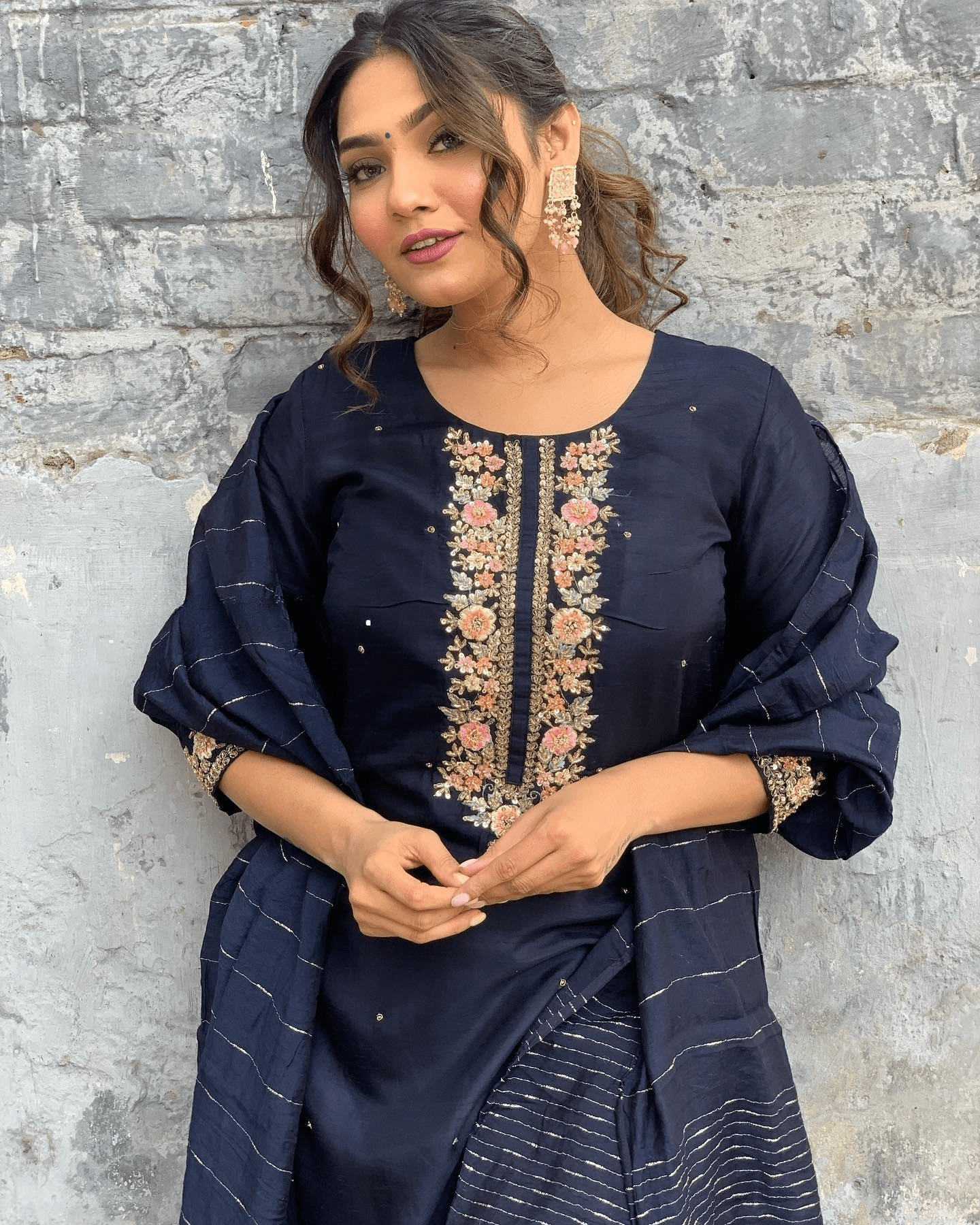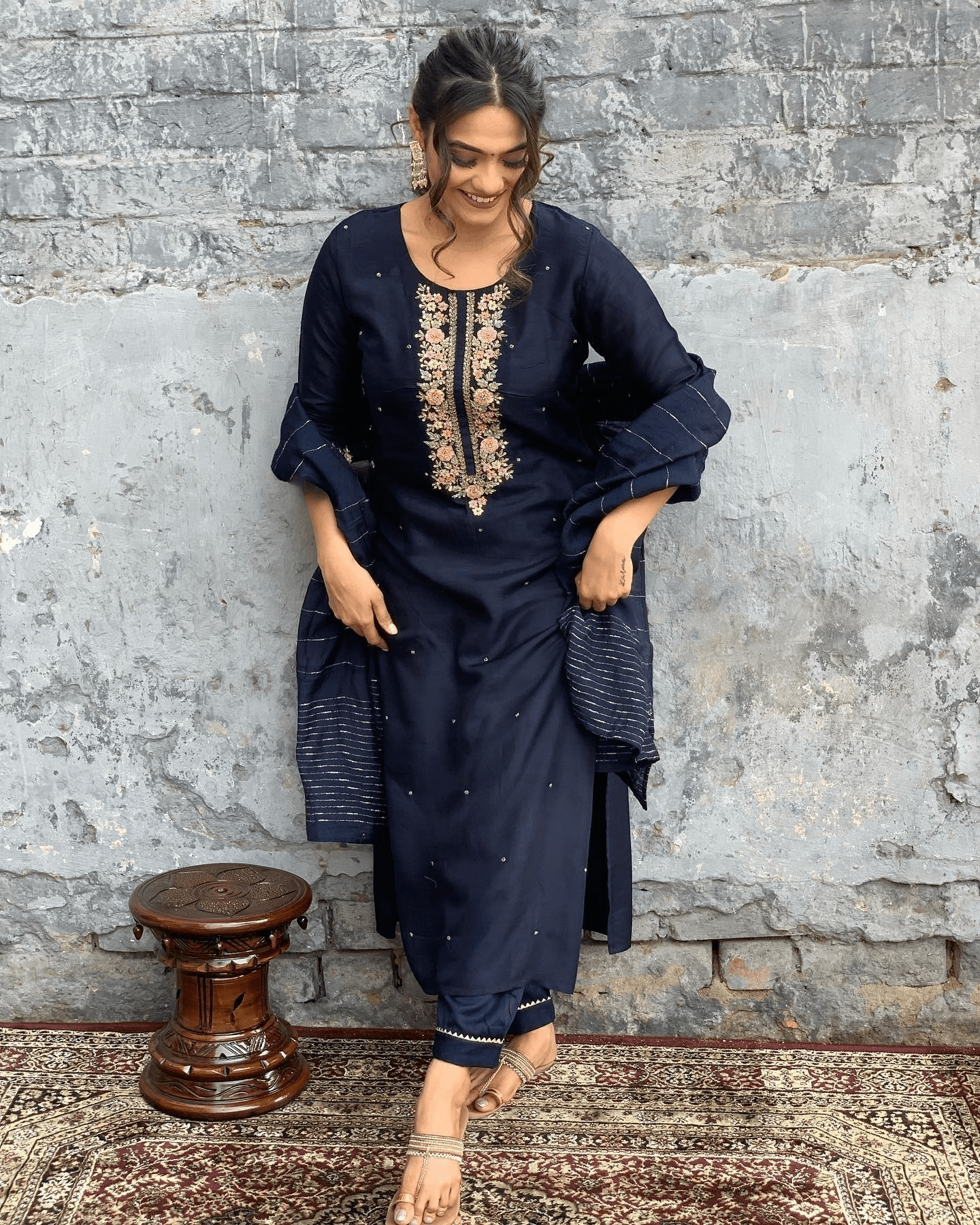 This ivory Anarkali set is a celebration of breezy elegance and festive flair. The flowing silhouette is enhanced by delicate floral block prints in soft pastel shades, while the gota detailing along the neckline and sleeve edges adds a subtle festive shimmer. A charming tassel tie-up at the front lends movement and a touch of whimsy. Paired with matching trousers and a lightweight dupatta, this ensemble is perfect for day events, mehendi ceremonies, or intimate get-togethers. Pair it with silver jhumkas and embroidered flats for an effortless ethnic look