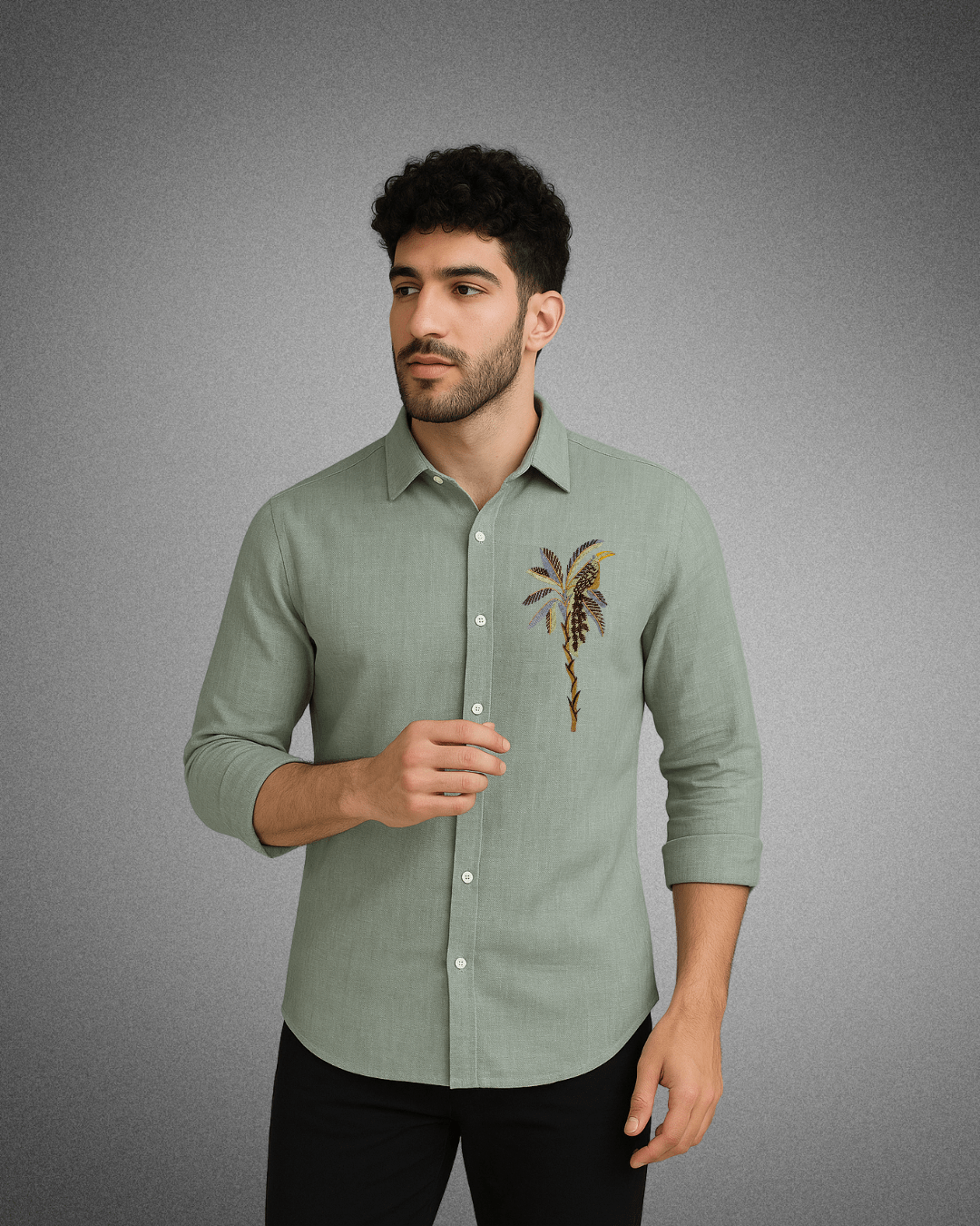 Introducing our Men’s Sage Green Palm Tree Embroidered Shirt, a perfect blend of comfort and style. This shirt is made from premium quality fabric that ensures a soft and breathable feel, making it ideal for all-day wear.