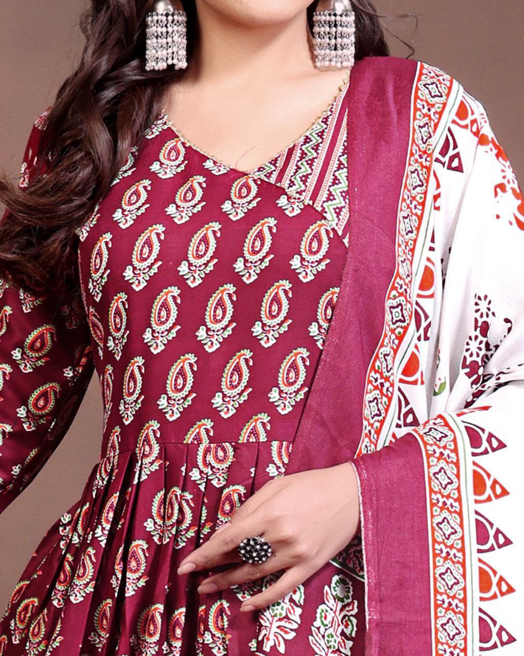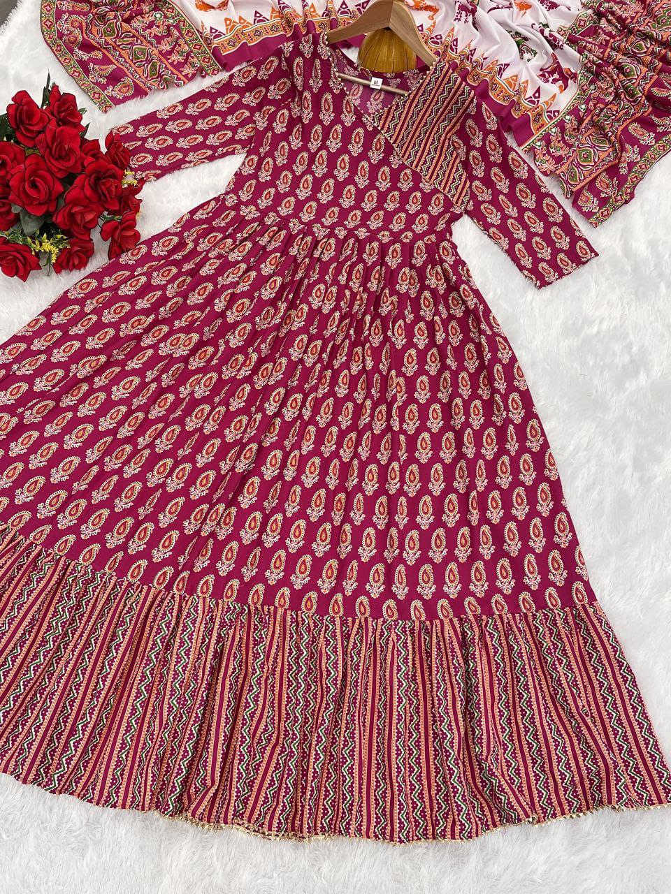 Turn heads with this radiant foil printed gown dupatta set that marries ethnic charm with modern comfort. Made from breathable rayon, the gown flows beautifully with a generous 2.5-meter flair and an impressive 54+ inch length, offering an elegant silhouette for special occasions and festive gatherings.