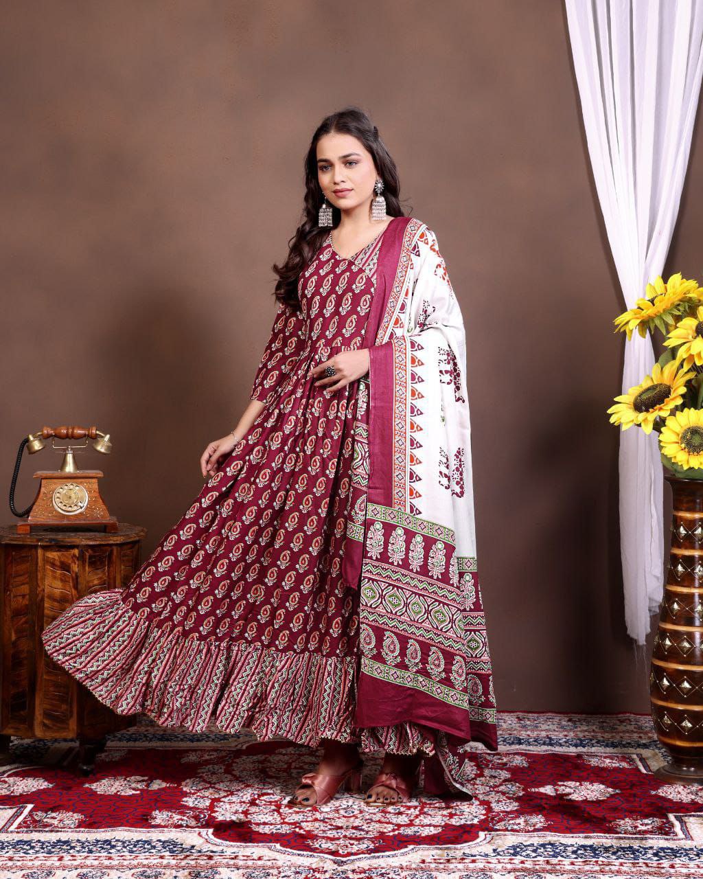 Highlighted in rich maroon with intricate foil prints and a ruffled hemline, this ensemble is both refined and vibrant. It’s ready in stock and available as a single piece, making it a rare find for your standout moments.