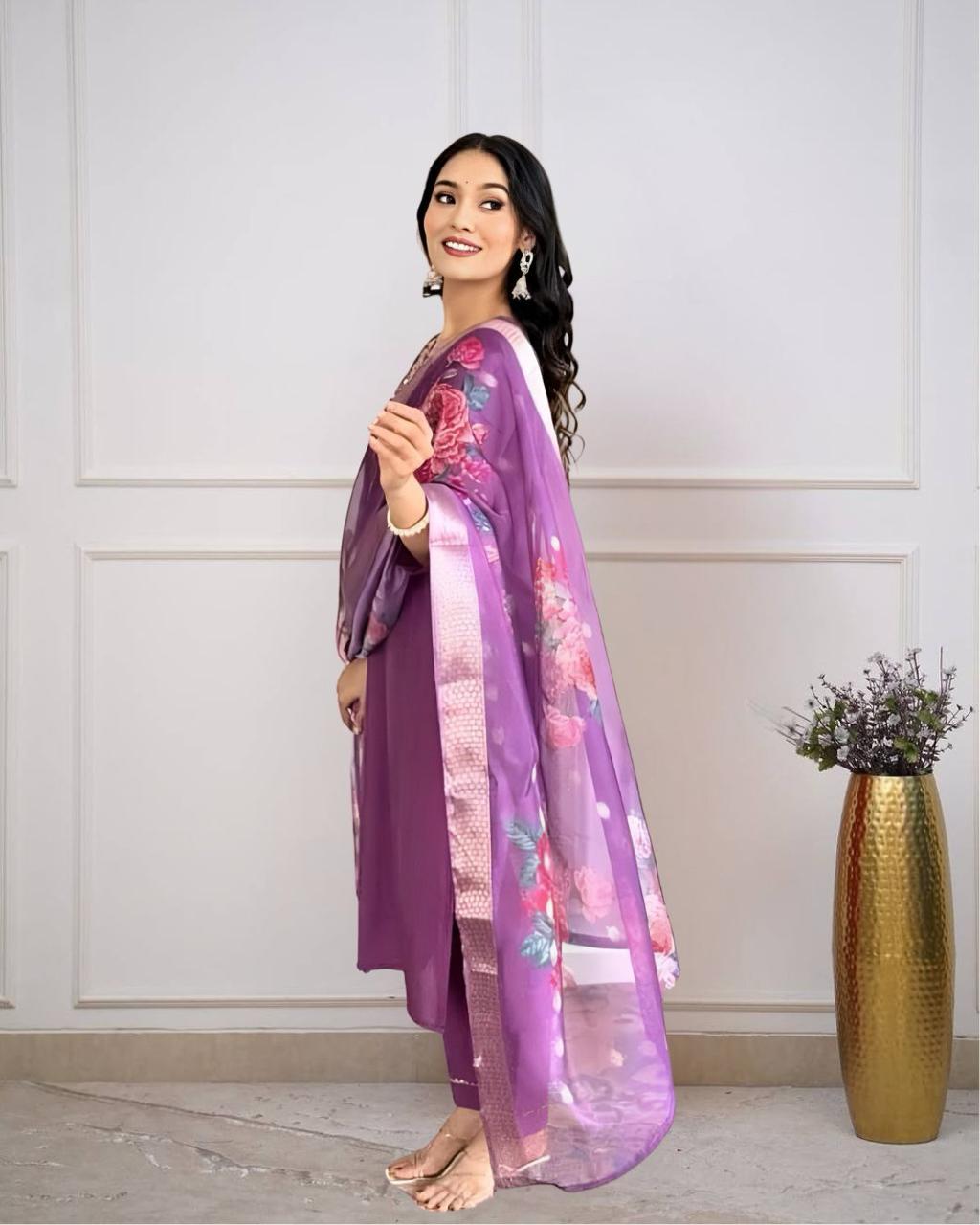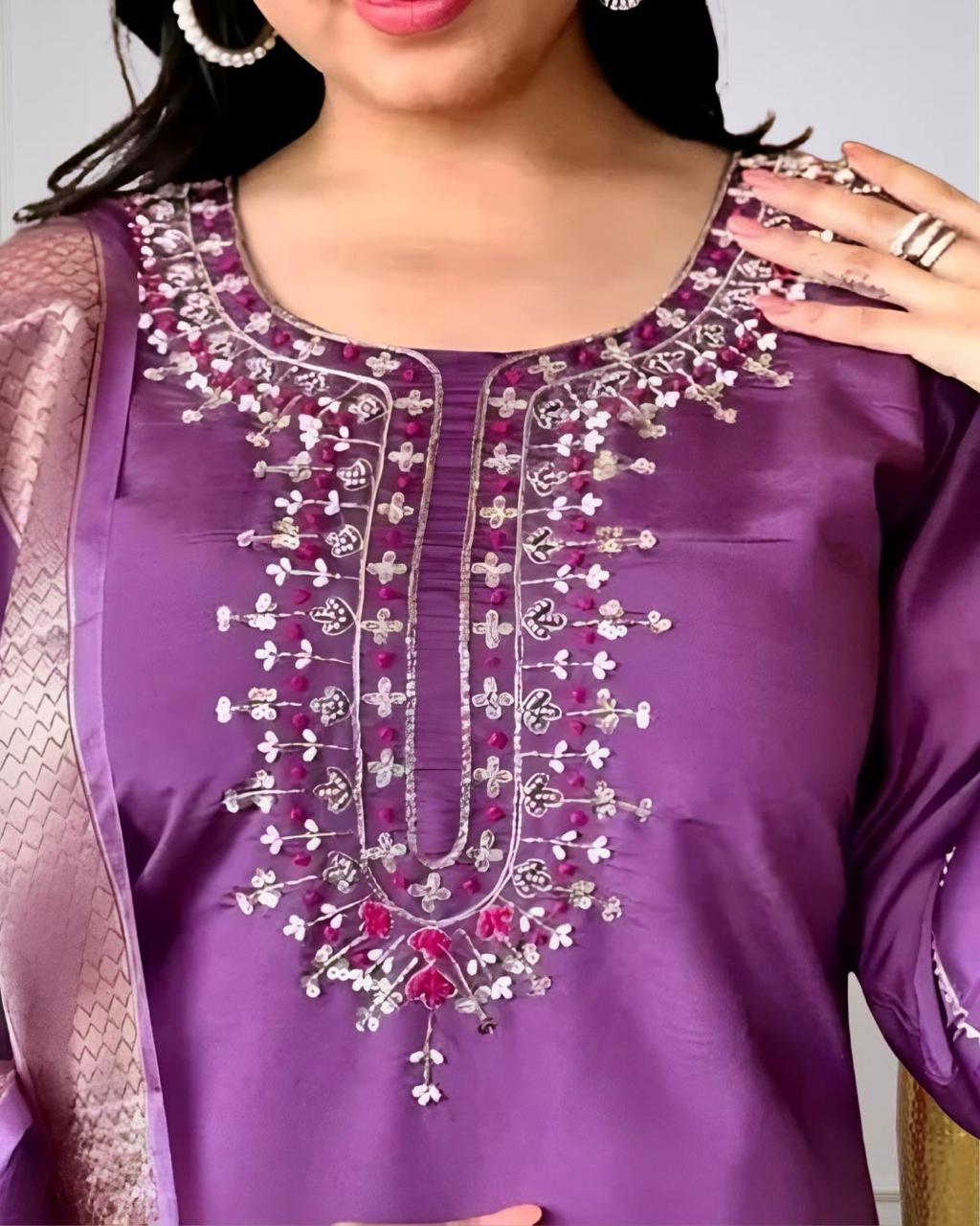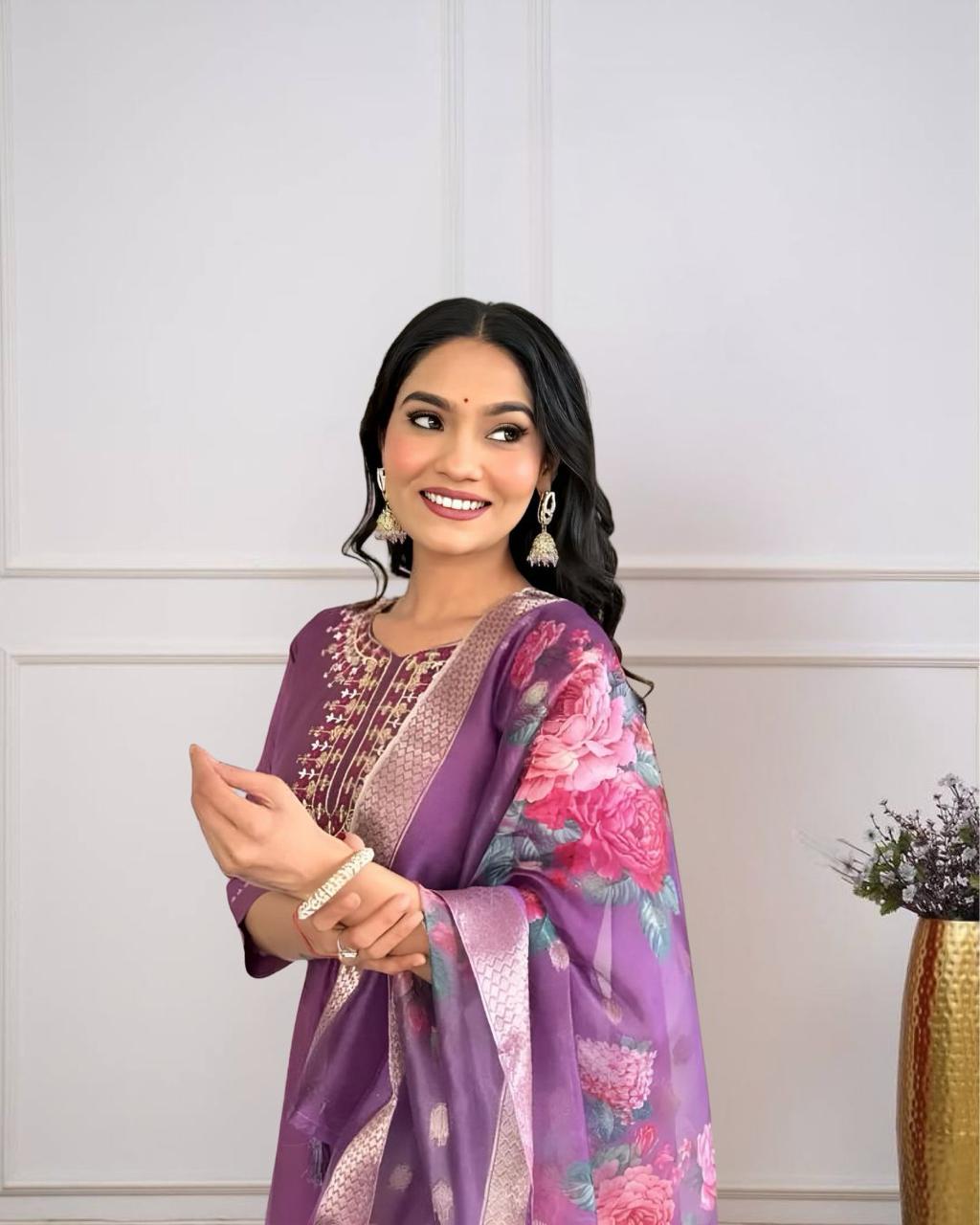 Introducing our Elegant Purple Floral Embroidered Dress, a stunning piece designed to make you stand out at any event. The dress showcases a rich purple hue adorned with intricate embroidery along the neckline and chest area, creating a captivating focal point. The flowing fabric is embellished with vibrant floral patterns, adding a burst of color and elegance. The dress is paired with delicate accessories, including a bracelet and earrings, enhancing its sophisticated appeal. Ideal for weddings, parties, or festive celebrations, this dress promises to make you feel both beautiful and confident